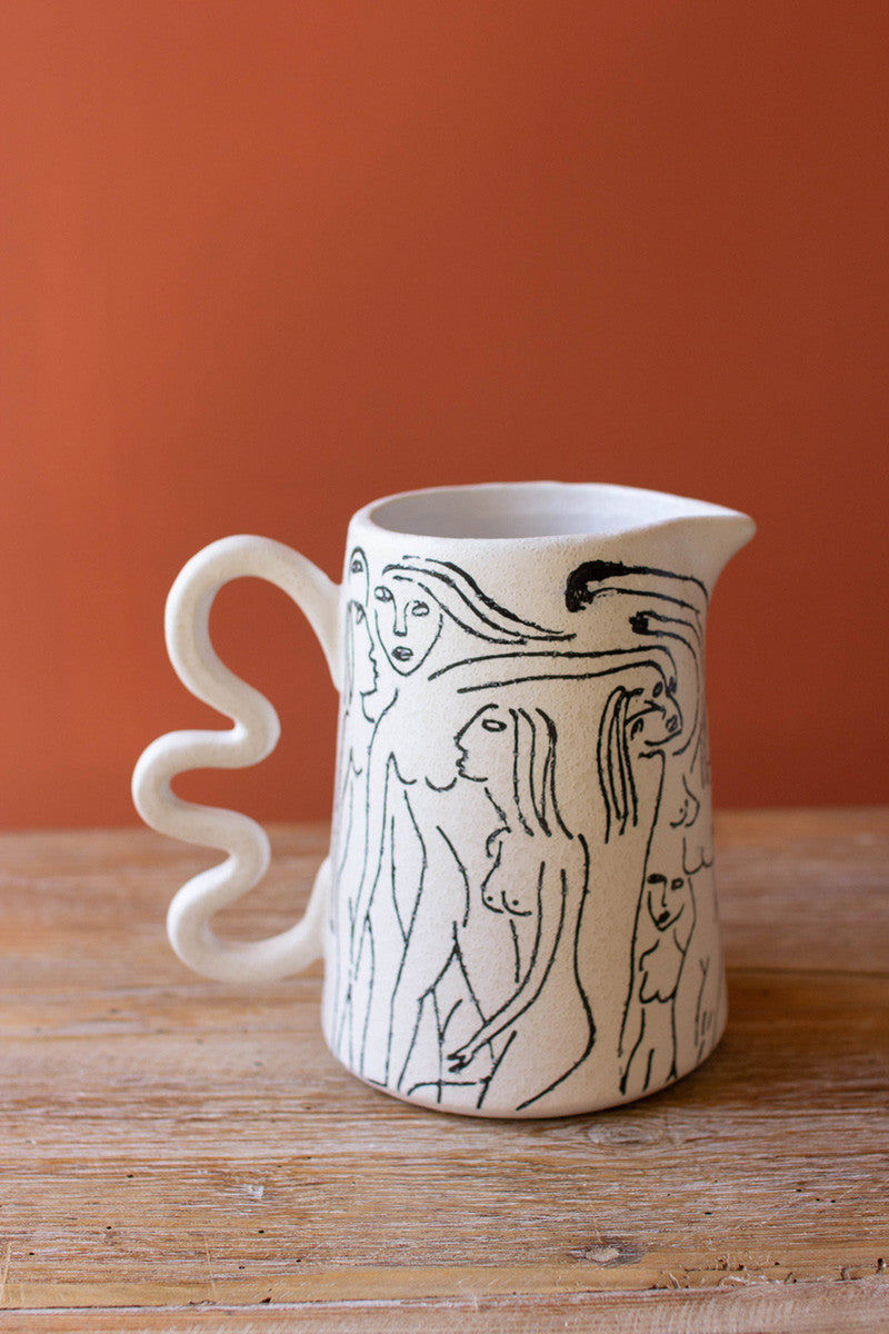 Regular price $37.95This little black and white pitcher featuring female figures is great for watering or pouring cream. It has a squiggle handle and ceramic construction, making it perfect for form and function, gifting, or display.Wipe clean with lint free cloth..