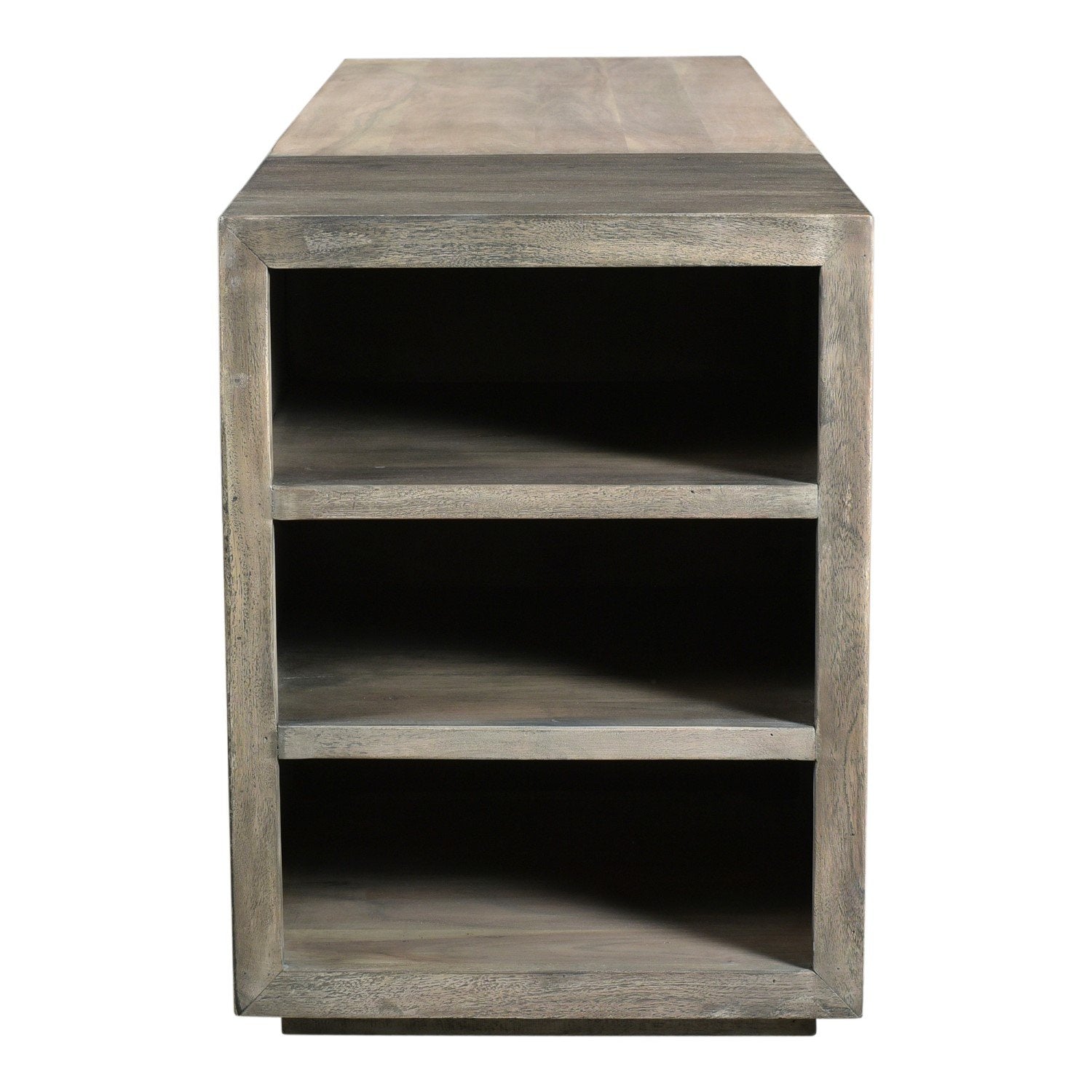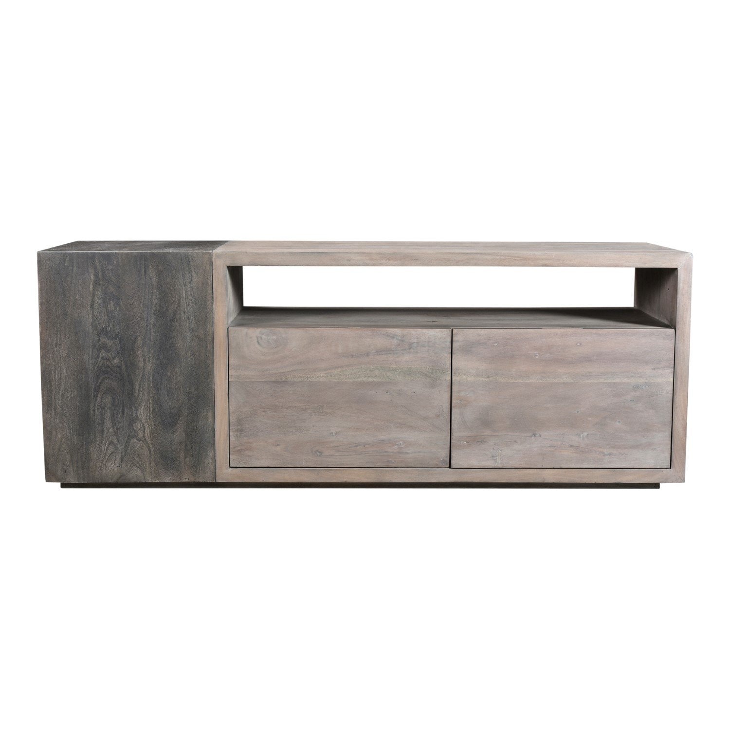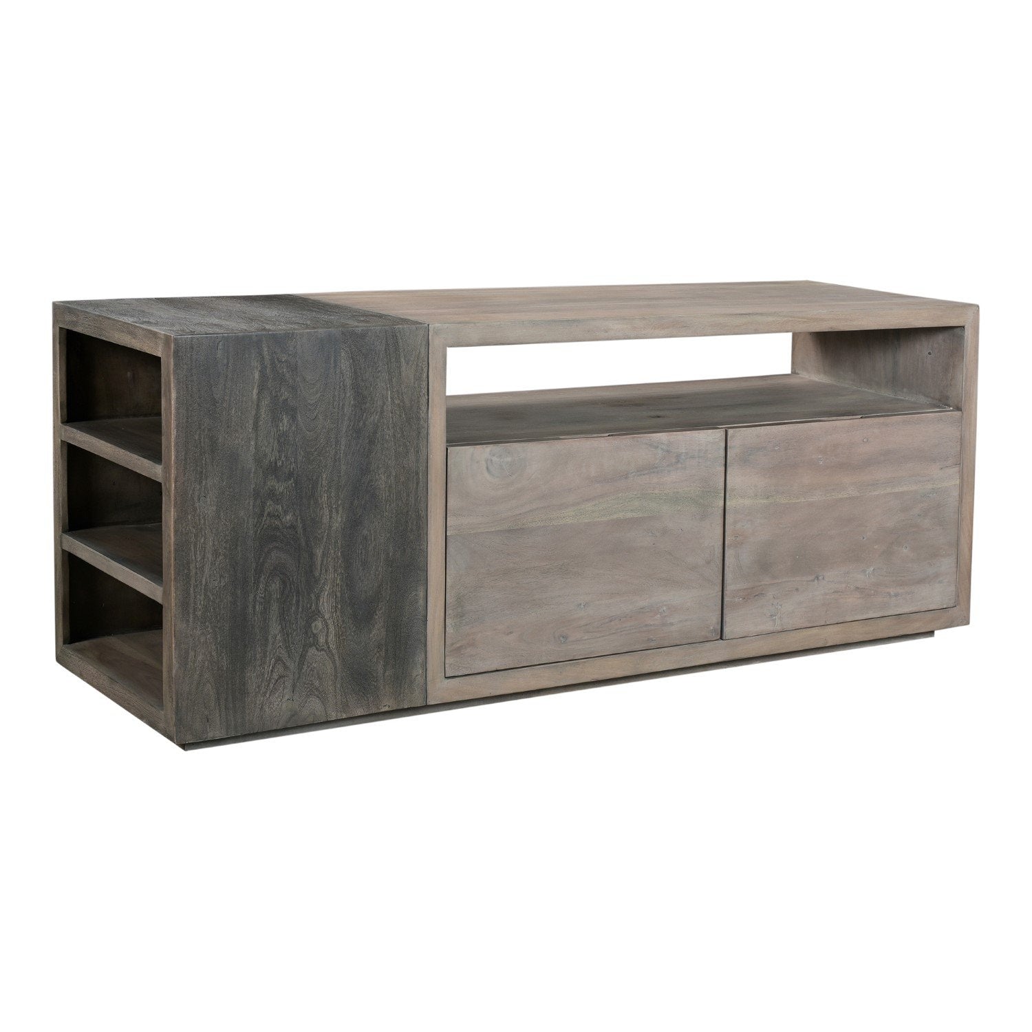Regular price $1,125.00The storage system of your dreams. With three shelves on the left-hand side of the media cabinet, while two large drawers and a mid-shelf slot, this media cabinet has the perfect combination of storage and display options for you. Made from solid acacia wood, the Timtam collection is features a light cloudy and metal grey finish, giving each product depth within its space. Solid wood provides a natural and long lasting piece of furniture. Lot's of storage compartments to help keep your place neat and tidy. 1 open shelf perfect for media consoles, 3 shelves on the side, 2 deep, large drawers. Contemporary Modern Style. Part of Timtam collection. Dimensions: 64"W 18"D 25"H. Product weight: 198.4lbs. Color: Light Grey. Matt Lacquer; Water-Based Stain finish. Assembly is not required. Made in India. We are offering 1 year limited warranty (covered for any manufacturer's defect). We understand how important your home is and how decorating your kitchen, dining room or bedrooms with classy, contemporary furnishings can help make it a place that reflects who you are. We believe in the power modern furniture has in creating not just a home but YOUR home. We believe in feeling good about our home's environment, and we think you do too.
